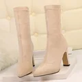 Cheap Offer for Plus Size High Heel Boots Sock Women 2019 Flock Shoes Sexy Party Thick Heel Ankle Booties Female Wi